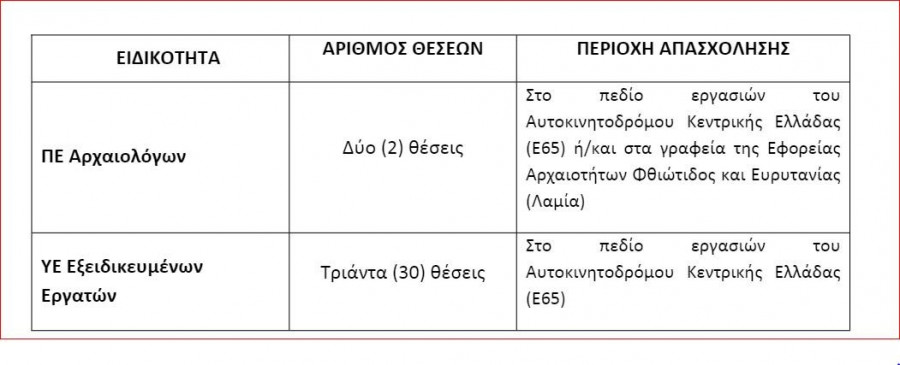 Αναλυτικότερα, η ΕΦΑ Φθιώτιδας και Ευρυτανίας, ανακοινώνει την πρόσληψη επιστημονικού προσωπικού και λοιπών ειδικοτήτων με σύμβαση εργασίας ιδιωτικού δικαίου ορισμένου χρόνου για την εκτέλεση των αρχαιολογικών εργασιών του Υποέργου 3 «Αρχαιολογικές έρευνες και εργασίες» της πράξης «Κατασκευή του τμήματος Λαμία – Ξυνιάδα του αυτοκινητοδρόμου Κεντρικής Ελλάδας (Ε65)», για χρονικό διάστημα 4 μηνών από την ημερομηνία υπογραφής της σύμβασης, με δυνατότητα ανανέωσης ή παράτασης της σύμβασης έως τη λήξη του υποέργου, εφόσον κριθεί αναγκαίο από την εξέλιξη αυτού.