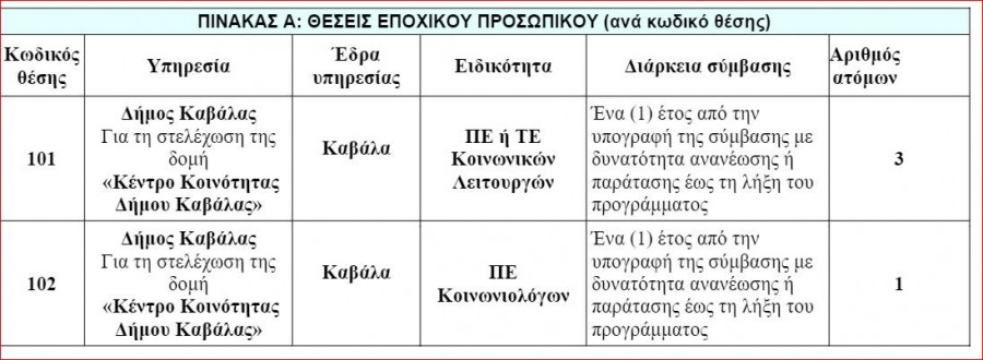 Αναλυτικότερα, γνωστοποιείται η πρόσληψη, με σύμβαση εργασίας ιδιωτικού δικαίου ορισμένου χρόνου, για την υλοποίηση της Πράξης “ΚΕΝΤΡΟ ΚΟΙΝΟΤΗΤΑΣ ΔΗΜΟΥ ΚΑΒΑΛΑΣ”, στο πλαίσιο του Επιχειρησιακού Προγράμματος «ΑΝΑΤΟΛΙΚΗ ΜΑΚΕΔΟΝΙΑ ΘΡΑΚΗ» 2014-2020, ΑΞΟΝΑΣ ΠΡΟΤΕΡΑΙΟΤΗΤΑΣ 4 «ΑΝΘΡΩΠΙΝΟΙ ΠΟΡΟΙ ΚΑΙ ΚΟΙΝΩΝΙΚΗ ΣΥΝΟΧΗ – ΕΚΤ».