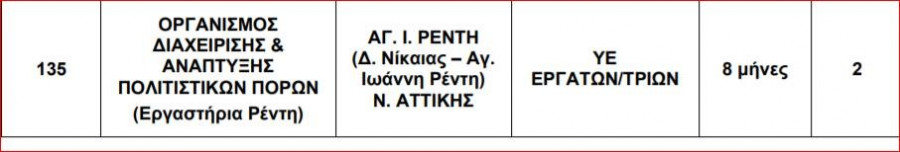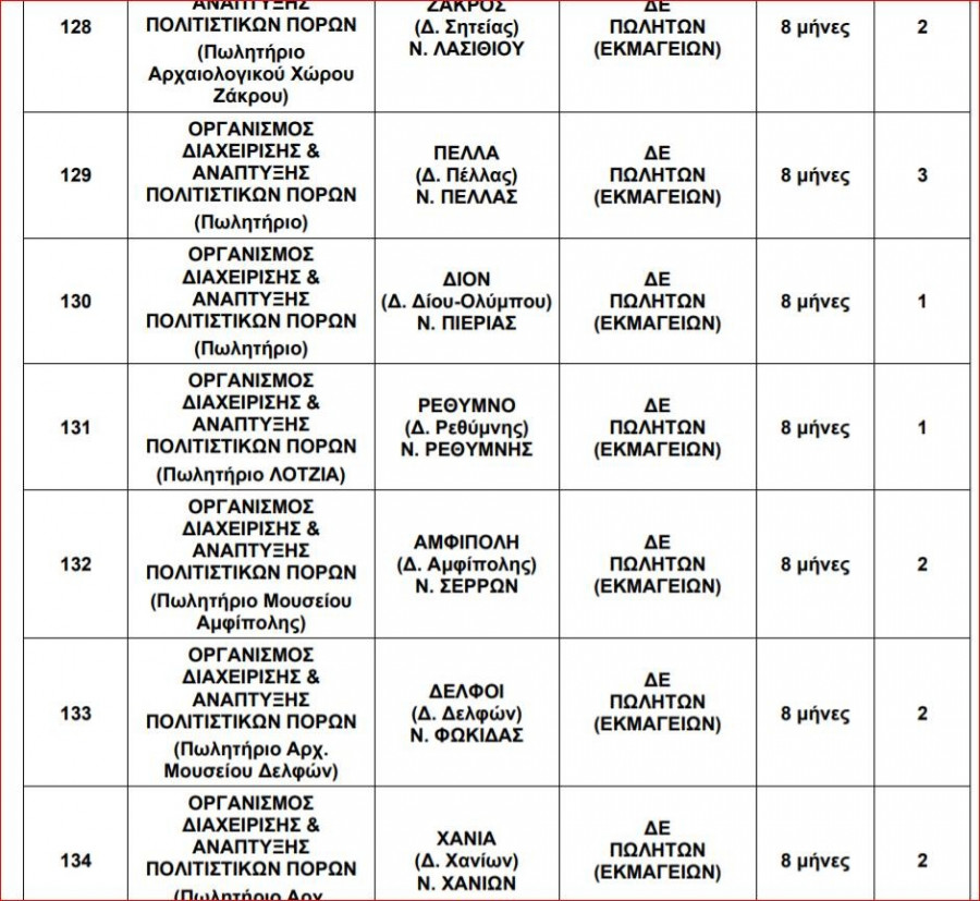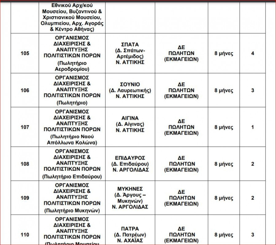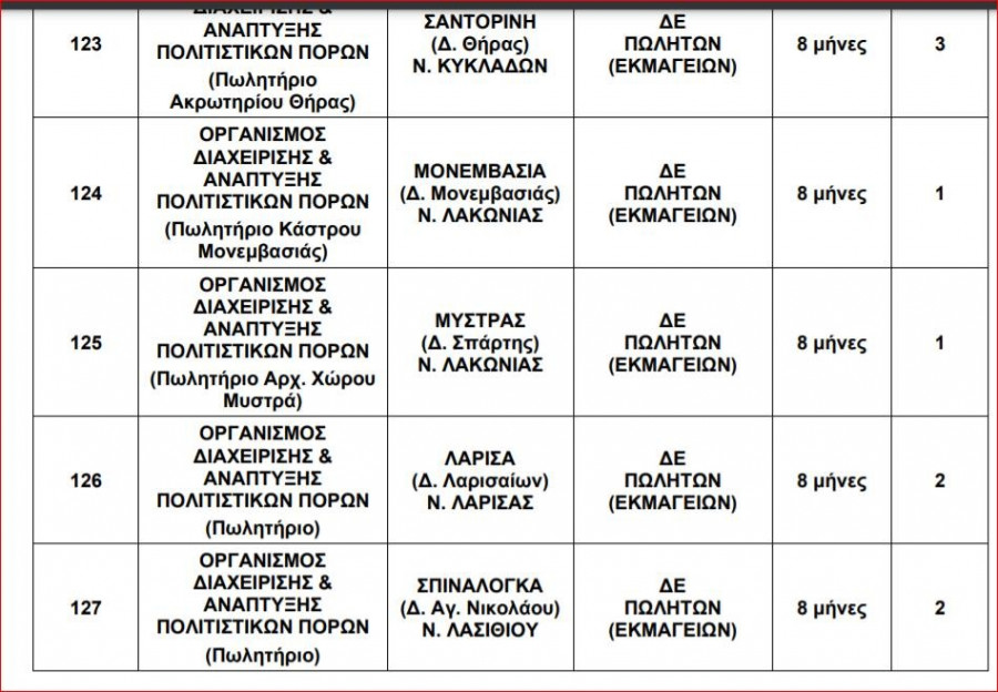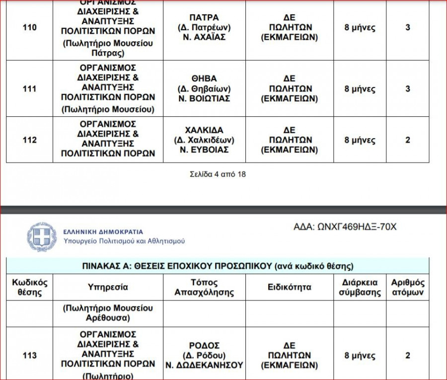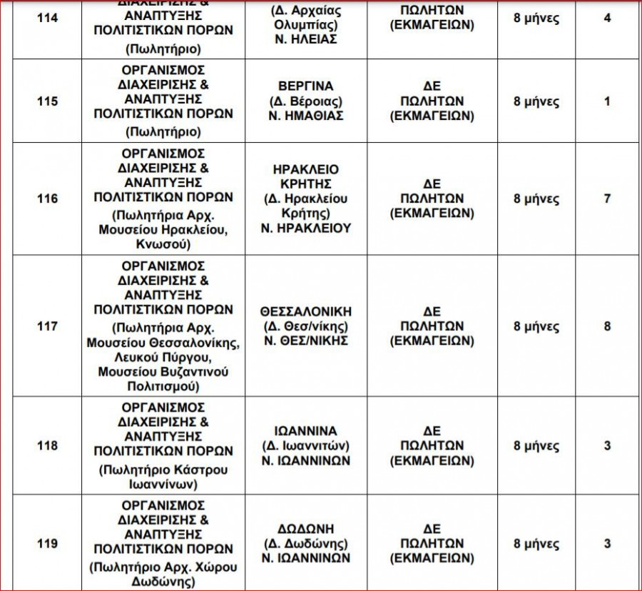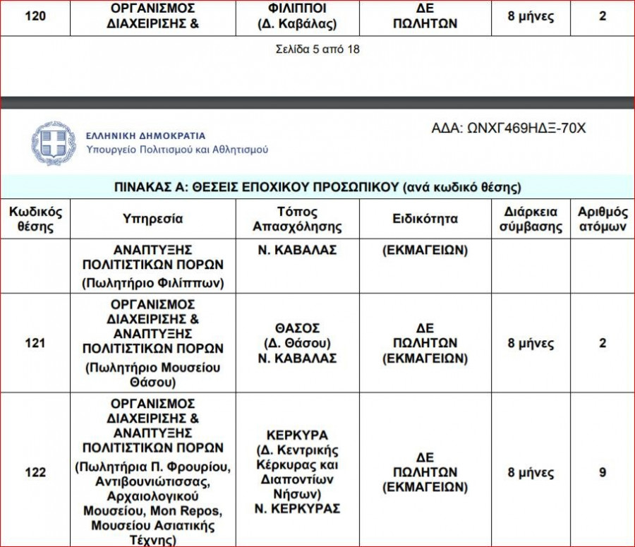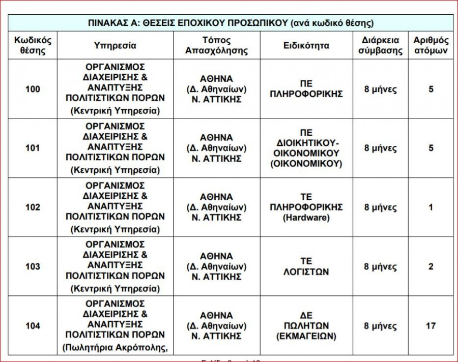 Συγκεκριμένα, ανακοινώθηκε η πρόσληψη, με σύμβαση εργασίας ιδιωτικού δικαίου ορισμένου χρόνου, συνολικά εκατόν δεκαπέντε (115) ατόμων για την κάλυψη εποχικών ή παροδικών αναγκών της Κεντρικής Υπηρεσίας του Οργανισμού Διαχείρισης & Ανάπτυξης Πολιτιστικών Πόρων (Ο.Δ.Α.Π.), που εδρεύει στην Αθήνα του Νομού Αττικής και των Περιφερειακών Υπηρεσιών αυτού.
