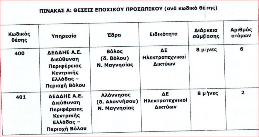 Η πρόσληψη θα γίνει με σύμβαση εργασίας ιδιωτικού δικαίου ορισμένου χρόνου, για την κάλυψη εποχικών ή παροδικών αναγκών της Διεύθυνσης Περιφέρειας Κεντρικής Ελλάδας της ΔΕΔΔΗΕ ΑΕ/Περιοχή Βόλου που εδρεύει στο Βόλο του Νομού Μαγνησίας.