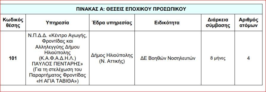 Η πρόσληψη θα γίνει με σύμβαση εργασίας ιδιωτικού δικαίου ορισμένου χρόνου, για την κάλυψη εποχικών ή παροδικών αναγκών του Ν.Π.Δ.Δ. «Κέντρο Αγωγής, Φροντίδας και Αλληλεγγύης Δήμου Ηλιούπολης (Κ.Α.Φ.Α.Δ.Η.Λ.) ΠΑΥΛΟΣ ΠΕΝΤΑΡΗΣ», που εδρεύει στο Δήμο Ηλιούπολης Ν. Αττικής.