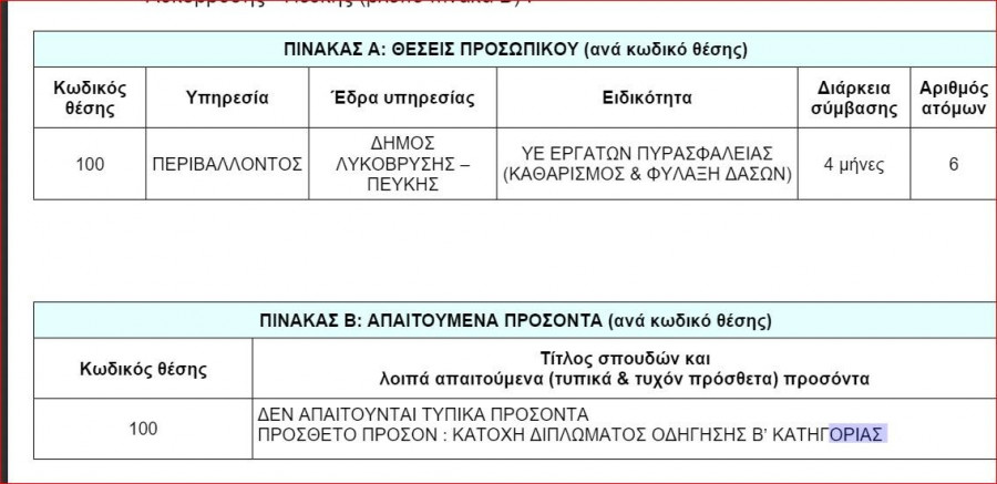 Ο Δήμος Λυκόβρυσης – Πεύκης Αττικής ανακοινώνει ότι θα προσλάβει προσωπικό με σύμβαση εργασίας ιδιωτικού δικαίου ορισμένου χρόνου διάρκειας τεσσάρων (4) μηνών, συνολικού αριθμού έξι (6) ατόμων στο πλαίσιο προστασίας των πολιτών και του φυσικού περιβάλλοντος ενόψει των θερινών μηνών για την αντιμετώπιση κατεπειγουσών εποχικών αναγκών των υπηρεσιών του.