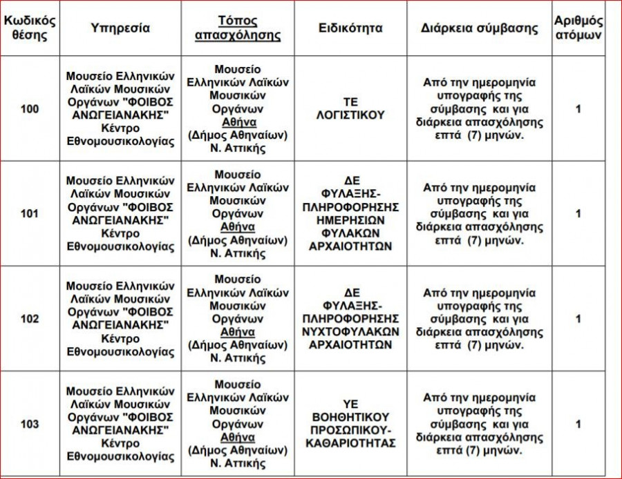 ΑΣΕΠ: Πρόσληψη, με σύμβαση εργασίας ιδιωτικού δικαίου ορισμένου χρόνου, συνολικά τεσσάρων (4) ατόμων για την κάλυψη εποχικών ή παροδικών αναγκών του Μουσείου Ελληνικών Λαϊκών Μουσικών Οργάνων "ΦΟΙΒΟΣ ΑΝΩΓΕΙΑΝΑΚΗΣ".