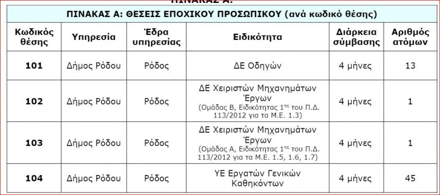 Ο Δήμος Ρόδου ανακοινώνει την πρόσληψη, με σύμβαση εργασίας ιδιωτικού δικαίου ορισμένου χρόνου, για την αντιμετώπιση κατεπειγουσών εποχικών ή πρόσκαιρων αναγκών στον τομέα της πυρασφάλειας, σύμφωνα με τις διατάξεις του άρθρου 206 του Ν. 3584/2007 «Κώδικας Κατάστασης Δημοτικών και Κοινοτικών Υπαλλήλων», όπως αντικαταστάθηκε και ισχύει εξήντα (60) ατόμων, στο Δήμο Ρόδου, που εδρεύει στη Ρόδο.