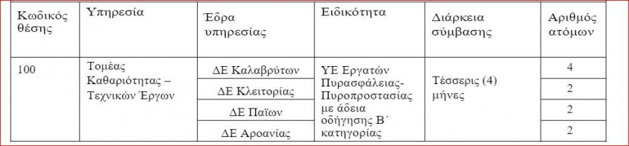 Ο Δήμος Καλαβρύτων, ανακοινώνει ότι θα προσλάβει δέκα (10) άτομα, με σύμβαση εργασίας ιδιωτικού δικαίου ορισμένου χρόνου, σύμφωνα με τις διατάξεις του 116 του Ν.4547/2018 και τις διατάξεις του άρθρου 206 του Ν. 3584/2007 όπως αντικαταστάθηκε με το άρθρο 41 παρ. 2 του Ν.4325/2015, με σκοπό την αντιμετώπιση εποχικών και πρόσκαιρων αναγκών κάλυψης δράσεων πυροπροστασίας – πυρασφάλειας.