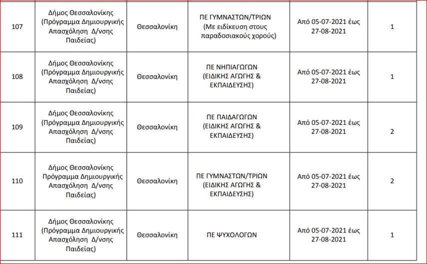 Ο Δήμος Θεσσαλονίκης ανακοινώνει την πρόσληψη, με σύμβαση εργασίας ιδιωτικού δικαίου ορισμένου χρόνου δίμηνης διάρκειας, τριάντα πέντε εκπαιδευτικών, ενός Ψυχολόγου, ενός Νοσηλευτή και δύο υπαλλήλων ειδικότητας ΔΕ Ειδικού Βοηθητικού Προσωπικού, με σχέση εργασίας ιδιωτικού δικαίου ορισμένου δίμηνης διάρκειας, για την υλοποίηση του προγράμματος Δημιουργικής Απασχόλησης Μαθητών.