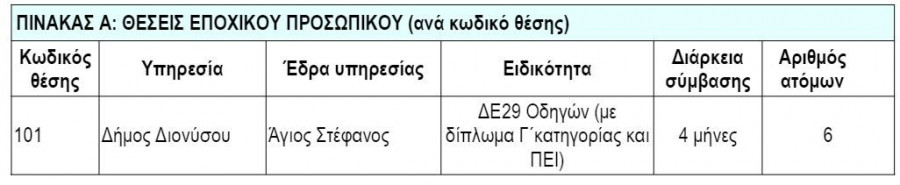 O Δήμος Διονύσου ανακοινώνει την πρόσληψη προσωπικού µε σύµβαση εργασίας ιδιωτικού δικαίου ορισµένου χρόνου, χρονικής διάρκειας έως 4 µήνες και έως τη λήξη της αντιπυρικής περιόδου (31-10-2021), συνολικoύ αριθµού 6 ατόµων για την κάλυψη των αναγκών των υπηρεσιών του.