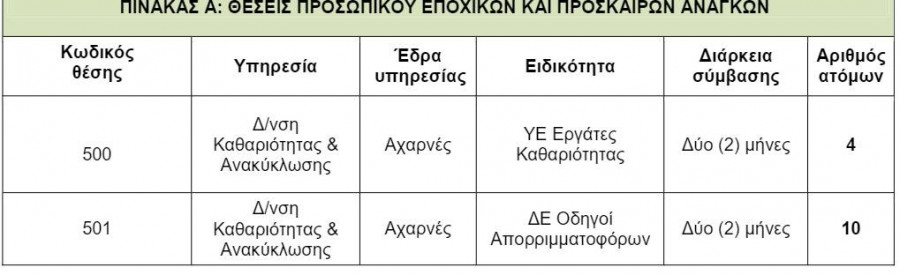 ΑΣΕΠ: Ο Δήμος Αχαρνών ανακοινώνει ότι θα προβεί στην πρόσληψη προσωπικού 14 ατόμων, με σύμβαση εργασίας ιδιωτικού δικαίου ορισμένου χρόνου, διάρκειας δύο (2) μηνών, για την αντιμετώπιση κατεπειγουσών εποχικών ή πρόσκαιρων αναγκών για τις ανάγκες της Δ/νσης Καθαριότητας & Ανακύκλωσης.