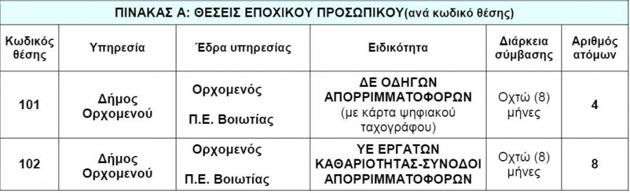ΑΣΕΠ: Πρόσληψη, με σύμβαση εργασίας ιδιωτικού δικαίου ορισμένου χρόνου, συνολικά δώδεκα ατόμων για την κάλυψη εποχικών ή παροδικών αναγκών του Δήμου Ορχομενού που εδρεύει στον Ορχομενό Περιφερειακής Ενότητας Βοιωτίας.