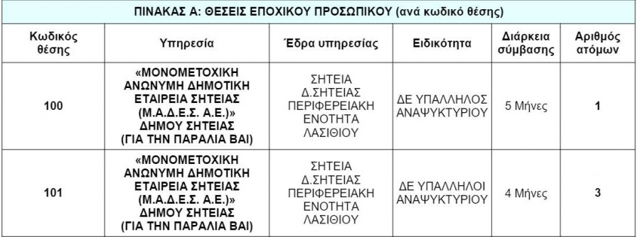 Γνωστοποιείται η πρόσληψη, με σύμβαση εργασίας ιδιωτικού δικαίου ορισμένου χρόνου, συνολικά 13 ατόμων για την κάλυψη εποχικών ή παροδικών αναγκών σε υπηρεσίες που παρέχουν έργο έναντι αντιτίμου από τους ωφελούμενους στη ΜΟΝΟΜΕΤΟΧΙΚΗ ΑΝΩΝΥΜΗ ΔΗΜΟΤΙΚΗ ΕΤΑΙΡΕΙΑ ΣΗΤΕΙΑΣ, που εδρεύει στο Δήμο Σητείας Περιφερειακής Ενότητας Λασιθίου.