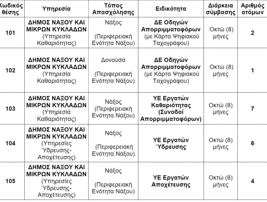 Ο Δήμος Νάξου και Μικρών Κυκλάδων ανακοινώνει την πρόσληψη, με σύμβαση εργασίας ιδιωτικού δικαίου ορισμένου χρόνου, συνολικά είκοσι (20) ατόμων για την κάλυψη εποχικών ή παροδικών αναγκών ανταποδοτικού χαρακτήρα του Δήμου Νάξου και Μικρών Κυκλάδων που εδρεύει στη Χώρα της Νάξου της Περιφερειακής Ενότητας Νάξου.