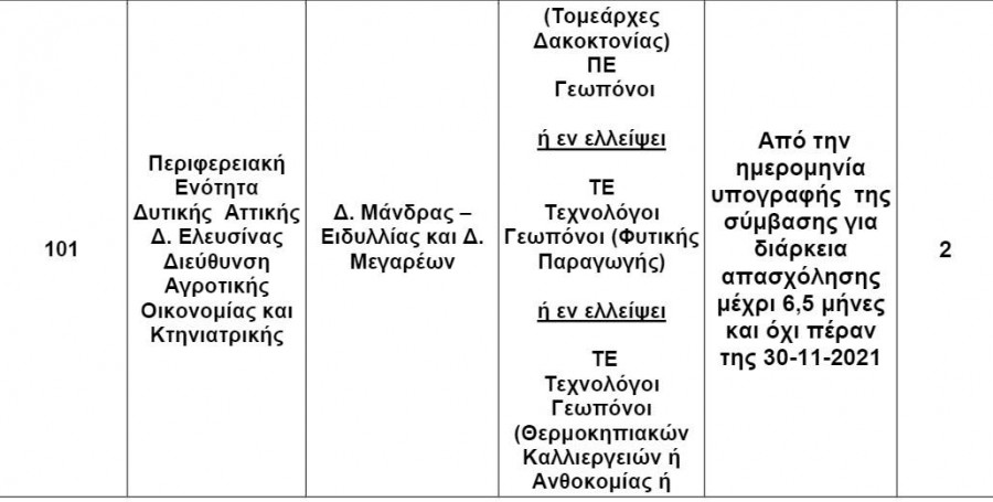 Η περιφέρεια Αττικής ανακοινώνει την πρόσληψη, με σύμβαση εργασίας ιδιωτικού δικαίου ορισμένου χρόνου, συνολικά επτά (7) ατόμων για την κάλυψη εποχικών ή παροδικών αναγκών στο Πρόγραμμα Καταπολέμησης του Δάκου της Ελιάς έτους 2021 των Διευθύνσεων Αγροτικής Οικονομίας & Κτηνιατρικής των Περιφερειακών Ενοτήτων Ανατολικής Αττικής, Δυτικής Αττικής και Νήσων.