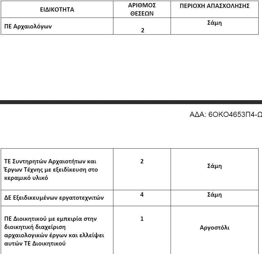 H Eφορεία Αρχαιοτήτων Κεφαλληνίας και Ιθάκης ανακοινώνει την πρόσληψη επιστημονικού προσωπικού και λοιπών ειδικοτήτων με σύμβαση εργασίας ιδιωτικού δικαίου ορισμένου χρόνου για την υλοποίηση του υποέργου 7 «Πρόσληψη προσωπικού για μεταφορά αρχαιοτήτων από αρχαιολογική συλλογή Σάμης» και του υποέργου 9 «Πρόσληψη ενός (1) ΠΕ Διοικητικού και ενός (1) ΠΕ Οικονομικού και ελλείψει αυτών ΤΕ Διοικητικού και ΤΕ Οικονομικού για τις ανάγκες υλοποίησης των εργασιών λόγω φυσικών καταστροφών μέσω ΠΔΕ» στο πλαίσιο του έργου «Αντιμετώπιση βλαβών που προκλήθηκαν σε μνημεία, μουσεία και υποδομές αρμοδιότητας της Εφορείας Αρχαιοτήτων Κεφαλληνίας και Ιθάκης (ΕΦΑΚΕΦΙ) από τον Κυκλώνα «Ιανό» στο νησί της Κεφαλονιάς το 2020» απολογιστικά και με αυτεπιστασία από την Εφορεία Κεφαλληνίας και Ιθάκης με κωδικό πράξης (ενάριθμο) 2020ΣΕ81400002 της ΣΑΕ 814 για το χρονικό διάστημα από την ημερομηνία υπογραφής της σύμβασης έως και 31.12.2021.