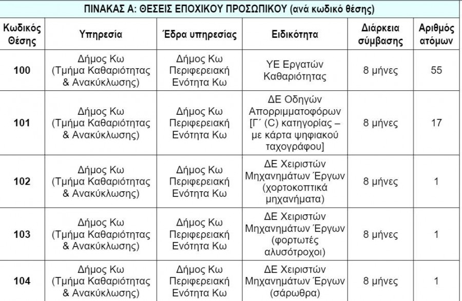 ΑΣΕΠ: Ο Δήμος Κω ανακοινώνει την πρόσληψη, με σύμβαση εργασίας ιδιωτικού δικαίου ορισμένου χρόνου, συνολικά εβδομήντα πέντε ατόμων για την κάλυψη εποχικών ή παροδικών αναγκών ανταποδοτικού χαρακτήρα.