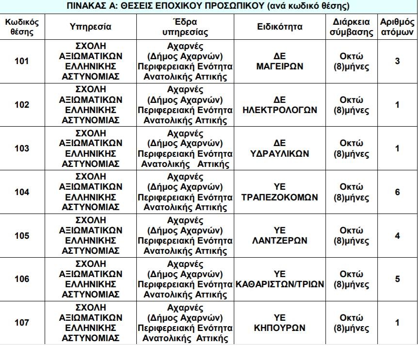 Η Σχολή Αξιωματικών Ελληνικής Αστυνομίας που εδρεύει στο Δήμο Αχαρνών Αττικής, ανακοινώνει ότι θα προσλάβει προσωπικό με σύμβαση εργασίας ιδιωτικού δικαίου ορισμένου χρόνου, συνολικά είκοσι ενός ατόμων για την κάλυψη εποχικών αναγκών.