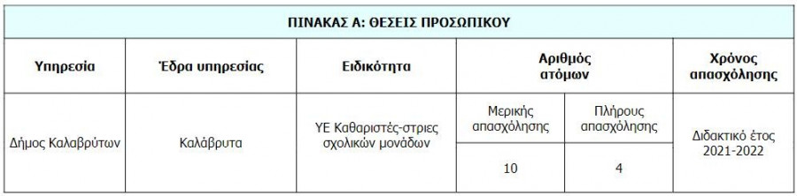 H πρόσληψη θα γίνει με σύμβαση εργασίας ιδιωτικού δικαίου ορισμένου χρόνου, για την καθαριότητα σχολικών μονάδων στο Δήμο Καλαβρύτων.