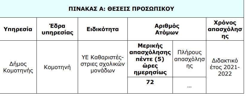 ΑΣΕΠ: Πρόσληψη, με σύμβαση εργασίας ιδιωτικού δικαίου ορισμένου χρόνου, συνολικά εβδομήντα δύο ατόμων για την καθαριότητα σχολικών μονάδων στο Δήμο Κομοτηνής.