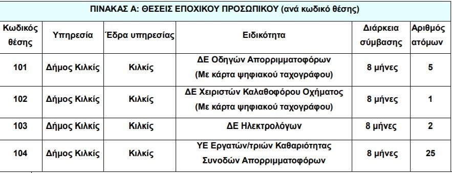 Την πρόσληψη, με σύμβαση εργασίας ιδιωτικού δικαίου ορισμένου χρόνου για την κάλυψη εποχικών ή αναγκών του Τμήματος Καθαριότητας της Διεύθυνσης Καθαριότητας, Ανακύκλωσης, Περιβάλλοντος και Πρασίνου και της Διεύθυνσης Τεχνικών Υπηρεσιών του Δήμου Κιλκίς.