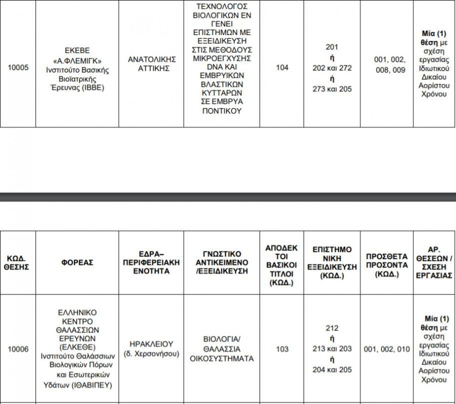 Αναλυτικότερα, πρόκειται για την πλήρωση 24 θέσεων ΕΕΠ, στο Ελληνικό Κέντρο Θαλάσσιων Ερευνών (ΕΛΚΕΘΕ), 6 θέσεων ΕΕΠ στο Ελληνικό Ινστιτούτο Παστέρ (ΕΙΠ) και 5 θέσεων ΕΕΠ στο Ερευνητικό Κέντρο Βιοϊατρικών Επιστημών (ΕΚΕΒΕ) «Α. Φλέμινγκ» (5Ε/2021).