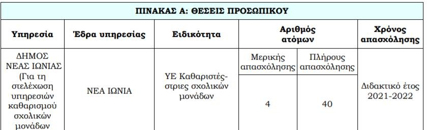 ΑΣΕΠ: Πρόσληψη, με σύμβαση εργασίας ιδιωτικού δικαίου ορισμένου χρόνου, συνολικά σαράντα τεσσάρων ατόμων για την καθαριότητα σχολικών μονάδων στο Δήμο Νέας Ιωνίας.