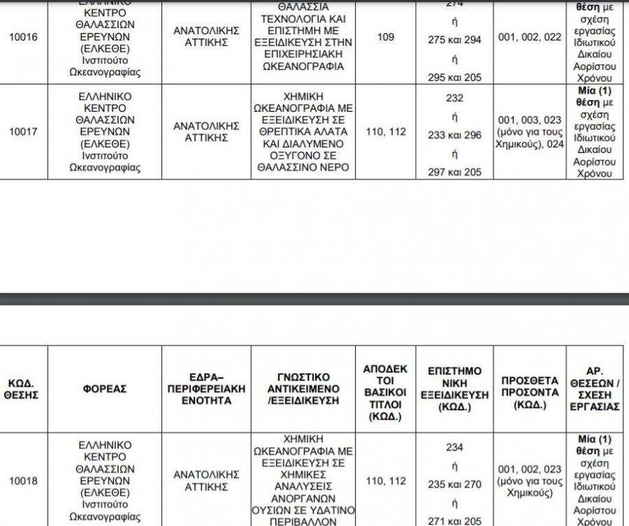 Αναλυτικότερα, πρόκειται για την πλήρωση 24 θέσεων ΕΕΠ, στο Ελληνικό Κέντρο Θαλάσσιων Ερευνών (ΕΛΚΕΘΕ), 6 θέσεων ΕΕΠ στο Ελληνικό Ινστιτούτο Παστέρ (ΕΙΠ) και 5 θέσεων ΕΕΠ στο Ερευνητικό Κέντρο Βιοϊατρικών Επιστημών (ΕΚΕΒΕ) «Α. Φλέμινγκ» (5Ε/2021).