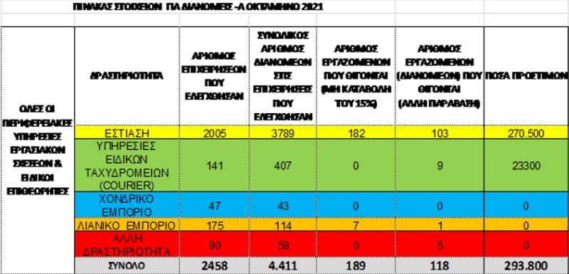 Ήδη, σύμφωνα με τα επίσημα στοιχεία του ΣΕΠΕ, κατά την περίοδο Ιανουαρίου-Αυγούστου 2021, διενεργήθηκαν πανελλαδικά 2.458 έλεγχοι που αφορούσαν στους όρους εργασίας 4.411 διανομέων.