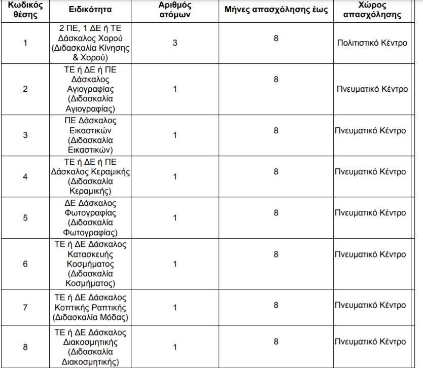 Oι προσλήψεις θα γίνουν µε αντικείµενο το έργο: «Λειτουργία τµηµάτων επιµόρφωσης, επαγγελµατικού προσανατολισµού και δηµιουργικής απασχόλησης: Θέατρο, Υποκριτική, Κινησιολογία, Χορός, Αγιογραφία, Φωτογραφία, Εικαστικά, Κεραµική, Κόσµηµα, ∆ιακοσµητική, Μόδα, Μουσική” συνολικής διάρκειας έως οχτώ (8) και εννέα (9) µήνες, ανάλογα την ειδικότητα.
