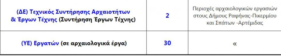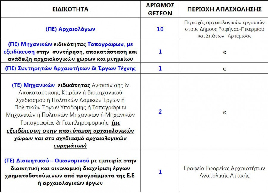 Οι προσλήψεις θα γίνουν με σύμβαση εργασίας ιδιωτικού δικαίου ορισμένου χρόνου, για την εκτέλεση των αρχαιολογικών εργασιών του υποέργου 10 «Αρχαιολογικές έρευνες και εργασίες» του ενταγμένου στο Ε.Π. «Υποδομές Μεταφορών, Περιβάλλον και Αειφόρος Ανάπτυξη 2014-2020» έργου με τίτλο «Συλλογή, επεξεργασία αστικών λυμάτων Δήμων Ραφήνας – Πικερμίου και Σπάτων – Αρτέμιδας και επαναχρησιμοποίηση – διάθεση επεξεργασμένων εκροών», για χρονικό διάστημα από την ημερομηνία υπογραφής της σύμβασης και για χρονικό διάστημα ενός (1) έτους, με δυνατότητα παράτασης ή ανανέωσης τη σύμβασης έως την ολοκλήρωση του υποέργου.