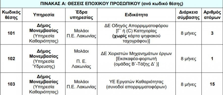 Προσλήψεις- Όλες οι ειδήσεις: Ο Δήμος Μονεμβασιάς ανακοινώνει την πρόσληψη , συνολικά δέκα εννέα ατόμων