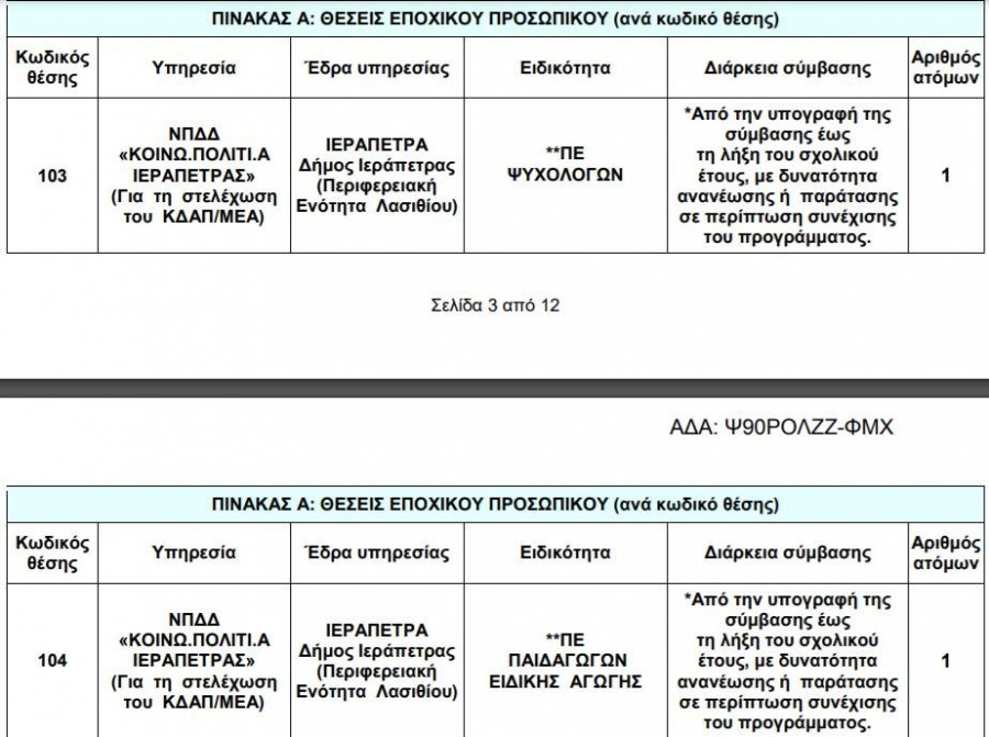 Προσλήψεις- Όλες οι ειδήσεις: Στην κάλυψη δεκαπέντε κενών θέσεων προχωρά ο Δήμος Ιεράπετρας για τις ανάγκες του προγράμματος «Εναρμόνιση Οικογενειακής και Επαγγελματικής Ζωής».