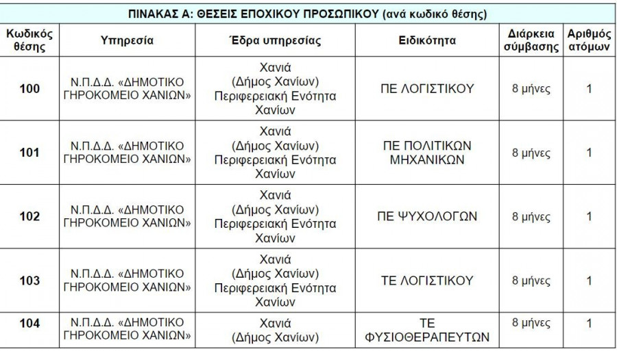 Η πρόσληψη θα γίνει με σύμβαση εργασίας ιδιωτικού δικαίου ορισμένου χρόνου, για την κάλυψη εποχικών ή παροδικών αναγκών του Ν.Π.Δ.Δ. «Δημοτικό Γηροκομείο Χανίων», που εδρεύει στα Χανιά της Περιφερειακής Ενότητας Χανίων.