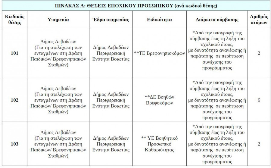 Προσλήψεις- Όλες οι ειδήσεις: Ο Δήμος Λεβαδέων ανακοινώνει την πρόσληψη, με σύμβαση εργασίας ιδιωτικού δικαίου ορισμένου χρόνου, συνολικά δέκα ατόμων για την υλοποίηση της δράσης «Εναρμόνιση Οικογενειακής και Επαγγελματικής Ζωής» (περίοδος 2021-2022).
