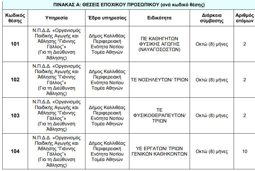 Η πρόσληψη θα γίνει με σύμβαση εργασίας ιδιωτικού δικαίου ορισμένου χρόνου, για την κάλυψη εποχικών ή παροδικών αναγκών του Ν.Π.Δ.Δ. «Οργανισμός Παιδικής Αγωγής και Άθλησης “Γιάννης Γάλλος”», που εδρεύει στο Δήμο Καλλιθέας της Περιφερειακής Ενότητας Νοτίου Τομέα Αθηνών.