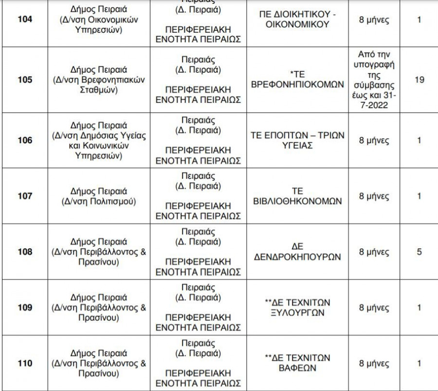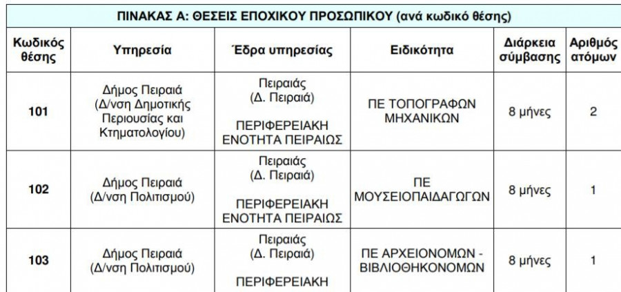 H πρόσληψη θα γίνει µε σύµβαση εργασίας ιδιωτικού δικαίου ορισµένου χρόνου, για την κάλυψη εποχικών ή παροδικών αναγκών του ∆ήµου Πειραιά, που εδρεύει στον Πειραιά της Περιφερειακής Ενότητας Πειραιώς, και συγκεκριµένα του εξής, ανά υπηρεσία, έδρα, ειδικότητα και διάρκεια σύµβασης, αριθµού ατόµων.