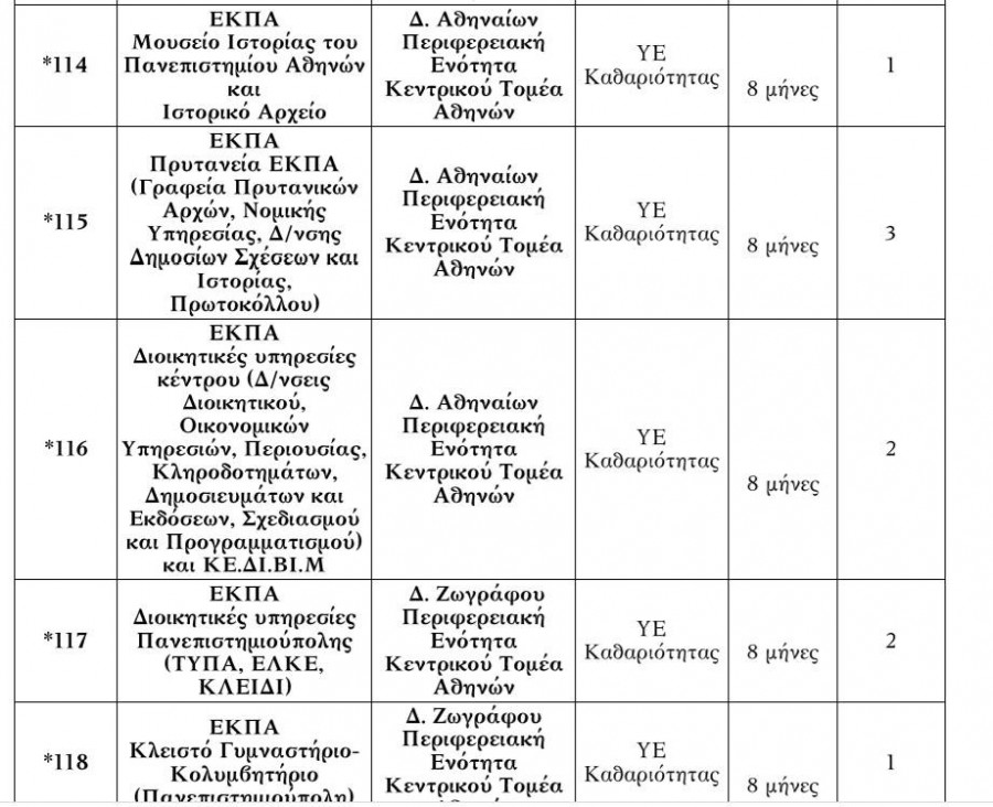 Το Εθνικό Καποδιστριακό Πανεπιστήμιο Αθηνών (ΕΚΠΑ) ανακοινώνει την πρόσληψη, με σύμβαση εργασίας ιδιωτικού δικαίου ορισμένου χρόνου, συνολικά εκατόν δέκα ατόμων για την κάλυψη εποχικών ή παροδικών αναγκών καθαριότητας.