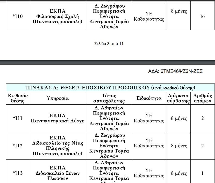 Το Εθνικό Καποδιστριακό Πανεπιστήμιο Αθηνών (ΕΚΠΑ) ανακοινώνει την πρόσληψη, με σύμβαση εργασίας ιδιωτικού δικαίου ορισμένου χρόνου, συνολικά εκατόν δέκα ατόμων για την κάλυψη εποχικών ή παροδικών αναγκών καθαριότητας.