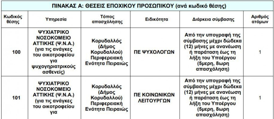 H πρόσληψη θα γίνει με σύμβαση εργασίας ιδιωτικού δικαίου ορισμένου χρόνου, συνολικά για την υλοποίηση του Υποέργου (3) «Δημιουργία οικοτροφείου για ψυχογηριατρικούς ασθενείς» της Πράξης «Ανάπτυξη υπηρεσιών και δομών ψυχικής υγείας από το Ψυχιατρικό Νοσοκομείο Αττικής ΔΑΦΝΙ».