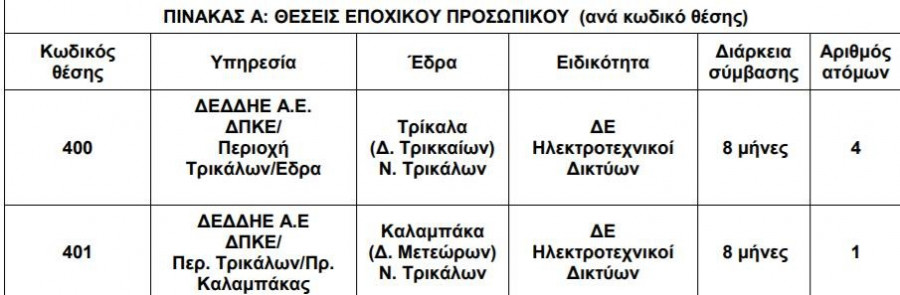 Η Διεύθυνση Περιφέρειας Κεντρικής Ελλάδας /Περιοχή Τρικάλων ανακοινώνει την πρόσληψη, με σύμβαση εργασίας ιδιωτικού δικαίου ορισμένου χρόνου, συνολικά πέντε (5) ατόμων για την κάλυψη εποχικών ή παροδικών αναγκών της ΔΕΔΔΗΕ Α.Ε/ΔΠΚΕ/Περιοχή Τρικάλων.