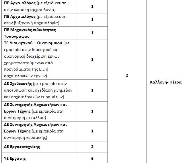 Οι προσλήψεις αφορούν στην εκτέλεση των αρχαιολογικών εργασιών του υποέργου 3 «Αρχαιολογικές εργασίες» της πράξης «Οδικός άξονας Καλλονής –Πέτρας (Α΄ ΦΑΣΗ)» για χρονικό διάστημα δύο (2) μηνών από την ημερομηνία υπογραφής της σύμβασης όπως αναγράφεται στον παρακάτω πίνακα, με δυνατότητα ανανέωσης ή παράτασης της σύμβασης έως τη λήξη του υποέργου, εφόσον κριθεί αναγκαίο από την εξέλιξη αυτού.