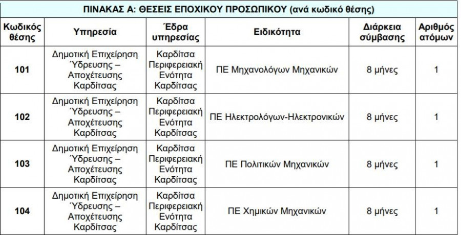 για την κάλυψη εποχικών ή παροδικών αναγκών της Δημοτικής Επιχείρησης Ύδρευσης - Αποχέτευσης Καρδίτσας (Δ.Ε.Υ.Α.Κ.), που εδρεύει στην Καρδίτσα, της Περιφερειακής Ενότητας Καρδίτσας.
