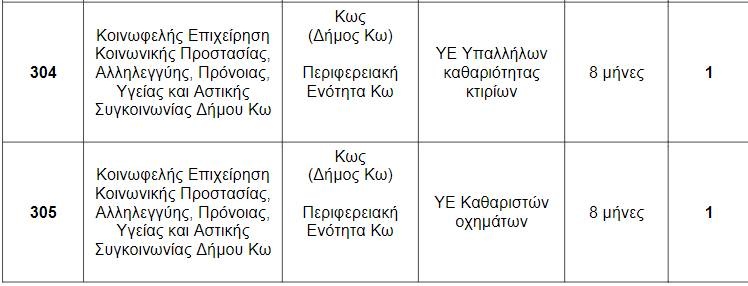 Την πρόσληψη, με σύμβαση εργασίας ιδιωτικού δικαίου ορισμένου χρόνου, συνολικά εννέα (9) ατόμων για την κάλυψη εποχικών ή παροδικών αναγκών στην Κοινωφελή Επιχείρηση Κοινωνικής Προστασίας, Αλληλεγγύης, Πρόνοιας, Υγείας και Αστικής Συγκοινωνίας Δήμου Κω , που εδρεύει στην Κω, της Περιφερειακής Ενότητας Κω.