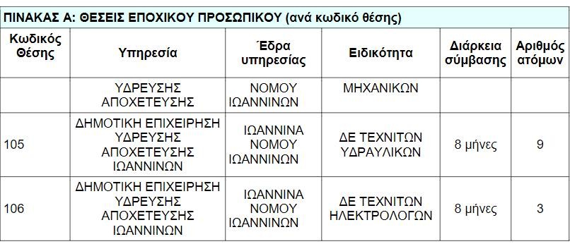 Η πρόσληψη θα γίνει με σύμβαση εργασίας ιδιωτικού δικαίου ορισμένου χρόνου, για την κάλυψη εποχικών ή παροδικών αναγκών της ΔΕΥΑ Ιωαννίνων, που εδρεύει στα Ιωάννινα του Νομού Ιωαννίνων.