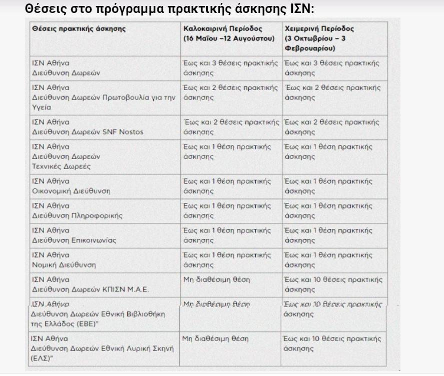 Θέσεις στο πρόγραμμα πρακτικής άσκησης ΙΣΝ: