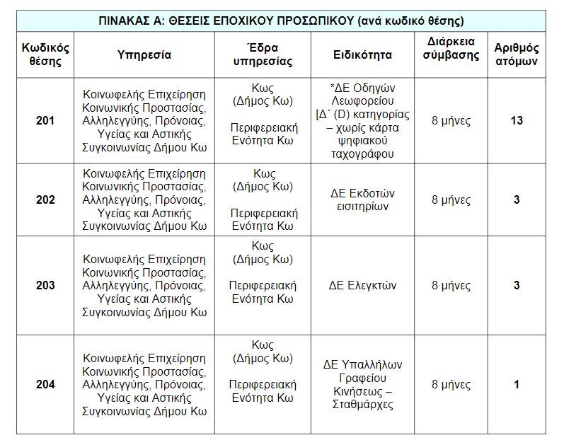 Η πρόσληψη θα γίνει με σύμβαση εργασίας ιδιωτικού δικαίου ορισμένου χρόνου, για την κάλυψη εποχικών ή παροδικών αναγκών στην Κοινωφελή Επιχείρηση Κοινωνικής Προστασίας, Αλληλεγγύης, Πρόνοιας, Υγείας και Αστικής Συγκοινωνίας Δήμου Κω.