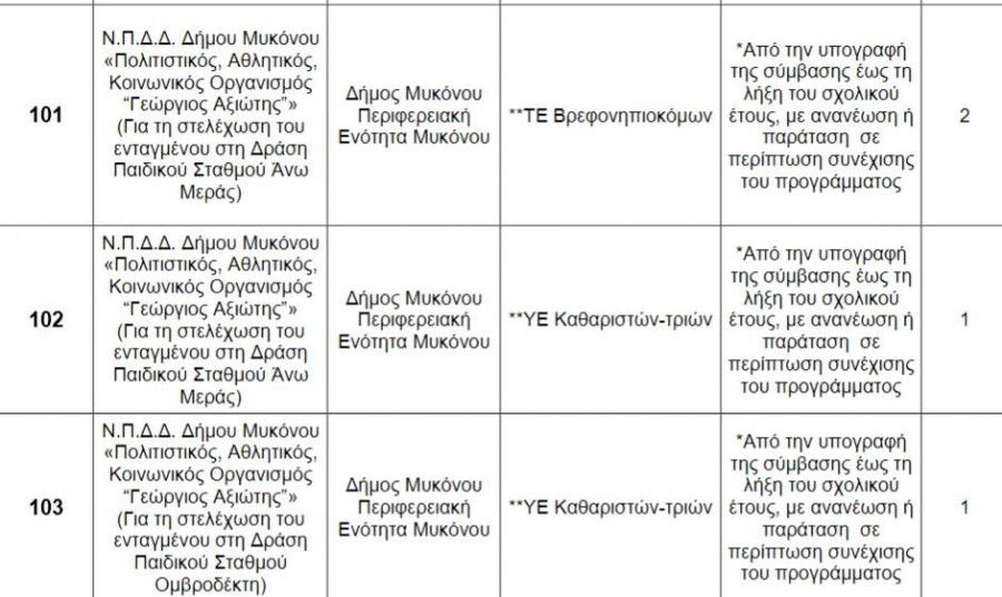 O Ν.Π.Δ.Δ. Δήμου Μυκόνου «Πολιτιστικός, Αθλητικός και Κοινωνικός Οργανισμός “Γεώργιος Αξιώτης”» ανακοινώνει την πρόσληψη, με σύμβαση εργασίας ιδιωτικού δικαίου ορισμένου χρόνου, συνολικά έξι (6) ατόμων για την υλοποίηση της δράσης «Εναρμόνιση Οικογενειακής και Επαγγελματικής Ζωής» (περίοδος 2021-2022).