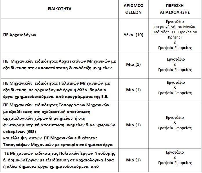 Οι προσλήψεις θα γίνουν με σύμβαση εργασίας ιδιωτικού δικαίου ορισμένου χρόνου, για την εκτέλεση των αρχαιολογικών ερευνών και εργασιών στο πλαίσιο του έργου «Μελέτη – Κατασκευή – Χρηματοδότηση – Λειτουργία – Συντήρηση και Εκμετάλλευση του Νέου Διεθνούς Αερολιμένα Ηρακλείου Κρήτης & Μελέτη – Κατασκευή και Χρηματοδότηση των Οδικών του Συνδέσεων» [2015ΣΕ07700000 της ΣΑΕ 077 του Π.Δ.Ε.] που υλοποιείται από την Εφορεία μας απολογιστικά και με αυτεπιστασία για χρονικό διάστημα από την ημερομηνία υπογραφής της σύμβασης και έως οκτώ μήνες.