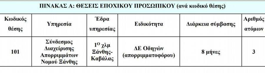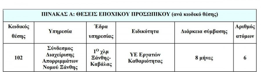 ΑΣΕΠ: Ο Σύνδεσμος Διαχείρισης Απορριμμάτων Νομού Ξάνθης ανακοινώνει την πρόσληψη, με σύμβαση εργασίας ιδιωτικού δικαίου ορισμένου χρόνου, συνολικά εννέα ατόμων για την κάλυψη εποχικών ή παροδικών αναγκών των υπηρεσιών του.
