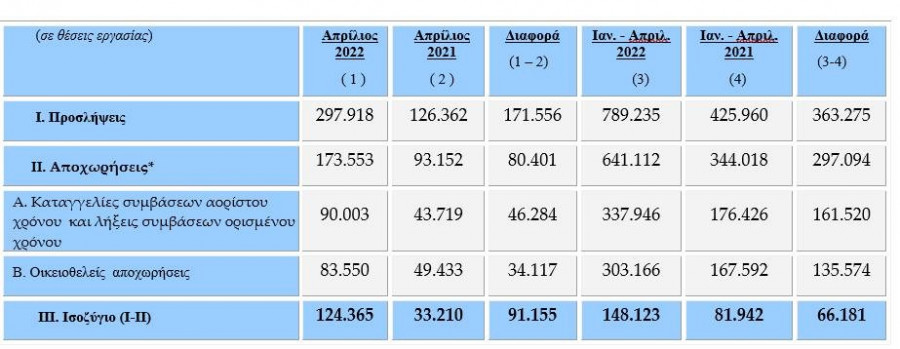 Έτσι, το ισοζύγιο των ροών μισθωτής απασχόλησης του πρώτου τετραμήνου του έτους 2022 είναι θετικό και διαμορφώνεται στις 148.123 θέσεις εργασίας.