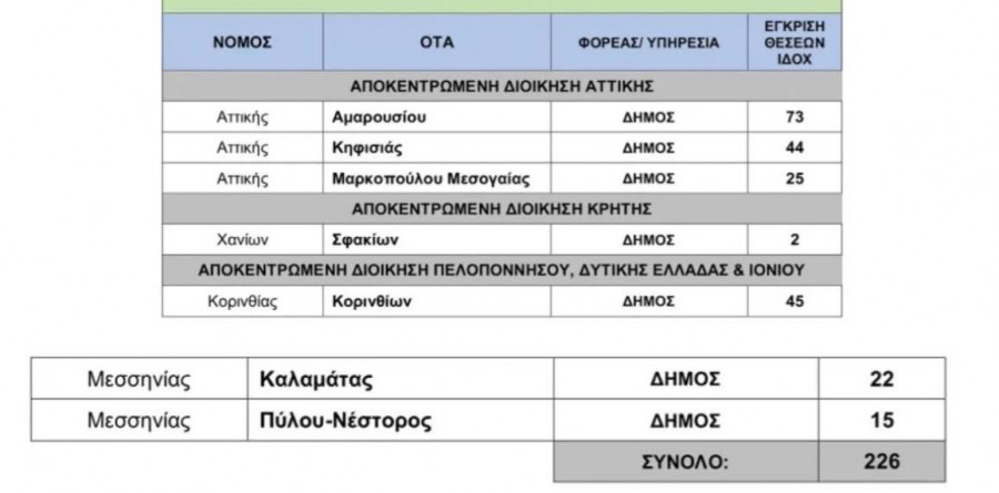 Σύμφωνα με την απόφαση εγκρίνεται η πρόσληψη 226 ατόμων σε συνολικά 7 δήμους μέσω ΑΣΕΠ με σχέση εργασίας ιδιωτικού δικαίου ορισμένου χρόνου (ΙΔΟΧ) για χρονικό διάστημα έως οκτώ (8) μήνες.