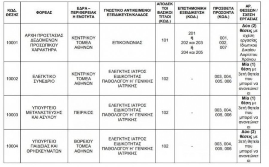 - Δύο θέσεις Ειδικού Επιστημονικού Προσωπικού στην Αρχή Προστασίας Δεδομένων Προσωπικού Χαρακτήρα (Ανεξάρτητη Αρχή) με σχέση εργασίας ιδιωτικού δικαίου αορίστου χρόνου,
